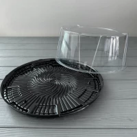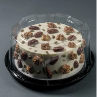 Дно чорного кольору + кришка прозора. Упаковка зроблена під торт, щільно закривається і дозволяє з легкістю транспортувати продукт.