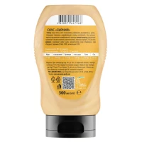 Состав: вода питьевая, масло подсолнечное рафинированное рафинированное дезодорированное, сахар, загустители (крахмал модифицированный, камедь ксантановая и гуаровая), соль поваренная пищевая, порошок сырный 1% (творог 91% (содержит молоко), эмульгатор фосфат натрия, соль поваренная пищевая)), уксус спиртовой, горчица дижонская (вода питьевая, зерна горчицы, уксус спиртовой, соль поваренная пищевая, регулятор кислотности кислота лимонная, антиоксидант пиросульфит калия (содержит сульфит)), порошок яичного желтка, сухие сливки (содержит молоко), эмульгатор крахмал модифицированный, регулятор кислотности кислота молочная, творожный порошок 0,3% (творог 95% (содержит молоко), эмульгатор цитрат натрия), пажитник, ароматизаторы (сыр, горчичный, масло), консервант кислота сорбиновая, красители натуральные (экстракт паприки, куркумин, β-каротин), антиоксидант Е385, натуральный экстракт сладкой травы стевии.